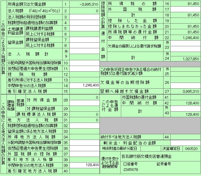 法人税の中間申告額(14)は還付請求になるので(22)欄に、控除できない所得税額(16)を(21)欄に転記します。同様に、地方法人税の中間申告額(39)は還付請求になるので(42)欄に転記します。