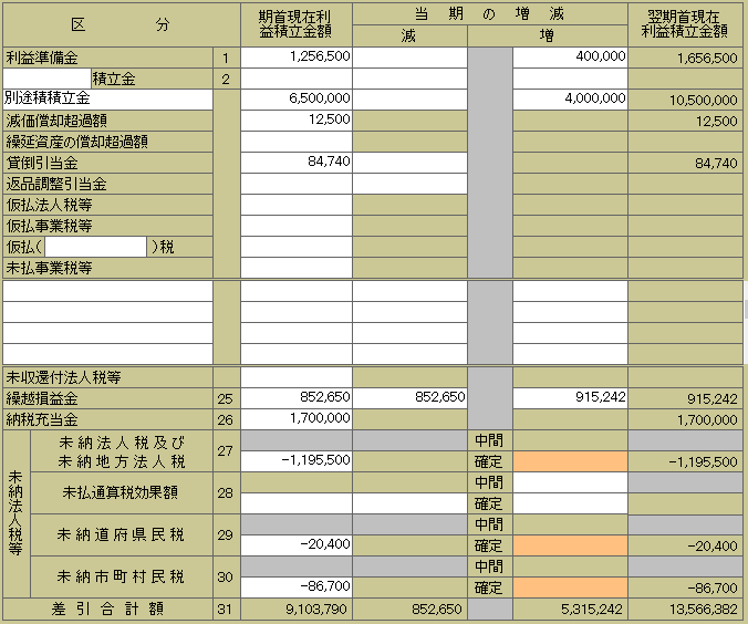 に転記します。未納法人税等の各欄は前期の確定税額ですが、利益積立金額から控除される項目なので、いずれもマイナスの金額で記載します。 |